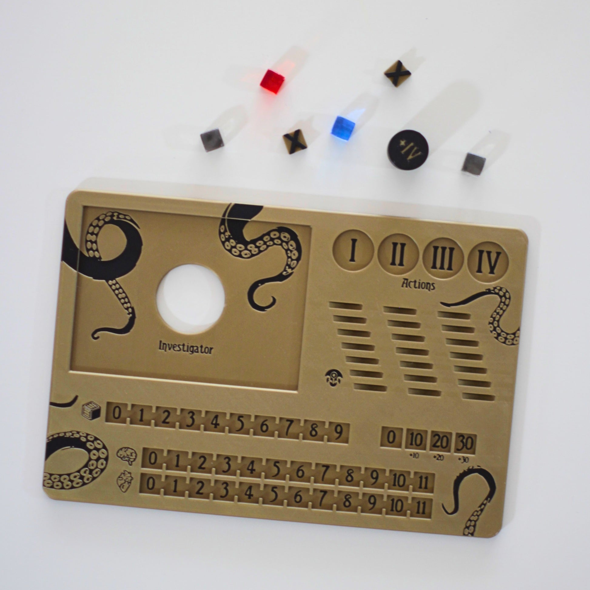 These 3D printed player boards fit a sleeved player card and up to 21 clue tokens, and include health, sanity, and resource tracks. The player board measures 18.9cm x 12.8cm.